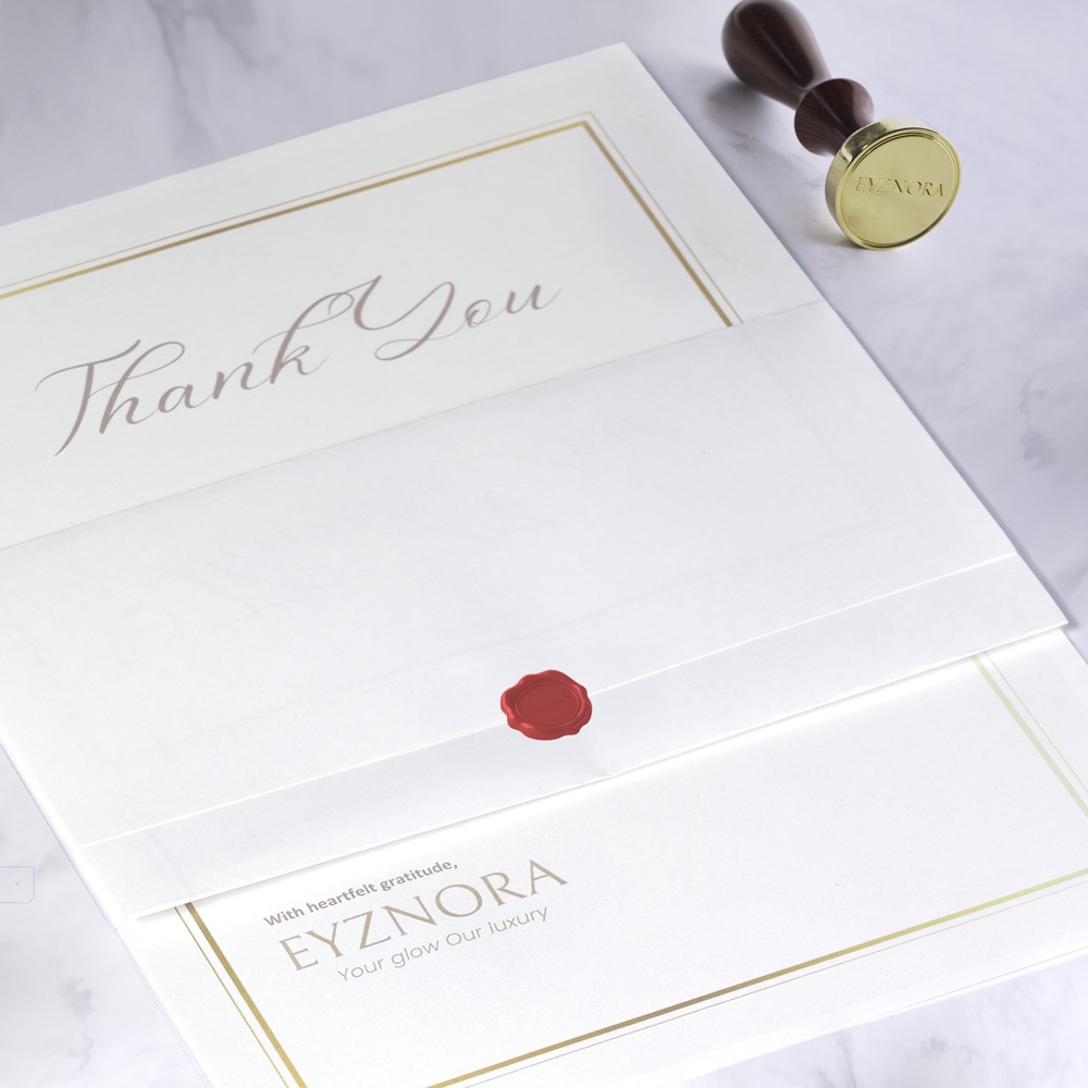 Each order includes a personalized note of thanks, elegantly presented and sealed with a classic wax seal. This thoughtful detail reflects our appreciation and commitment to making your Eyznora experience truly special.